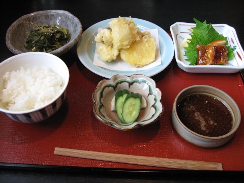 ご飯、漬物、揚げ物、焼き物、煮物それに蕎麦(ぶっかけorかけ)が付いて1000円。