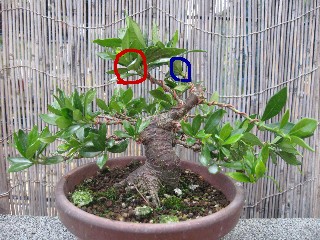 ↑現時点での構想は赤囲いの芽を新たな立替芽として伸ばしていく予定ですが、一方で、保険的な感じで青囲いの芽も一応、残しています。