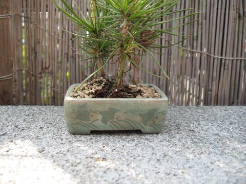 ↑昨年、相方さんが「カワイイ黒松盆栽を作る」ということで、相方さん所有の絵鉢に実生苗を植えました。
