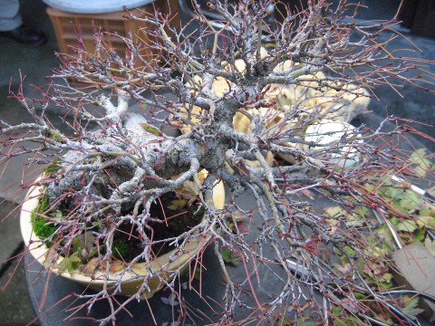 予報では降水確率が高かったのですが、朝から晴れていて、しかも暖かくて盆栽作業には良い日でした。