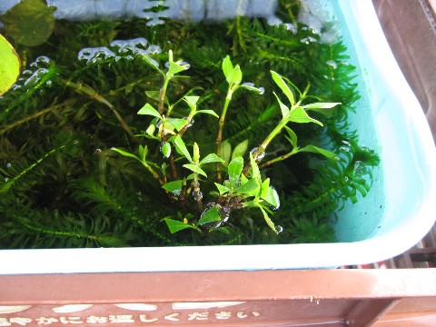 少し前に(決して太いとはいえないですが)クチナシの剪定枝を水草の中に放り込んでおいたのがあります。