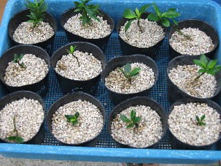 昨日、ふと思い立って挿し芽しておいたクチナシの芽を挿し床(?)から抜いて、ポットに移植しました。