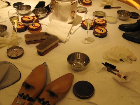 ↓テーブルに準備された各種靴磨きの小道具類