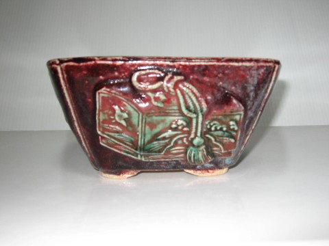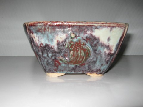 古都忠寛 辰砂窯変緑青釉長方(玉手箱・亀文) 15×13.5×7.5