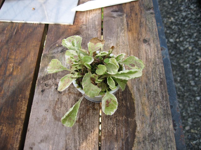 一方、日陰で管理したチリメンジュウニヒトエは、少し葉の色も悪いです。