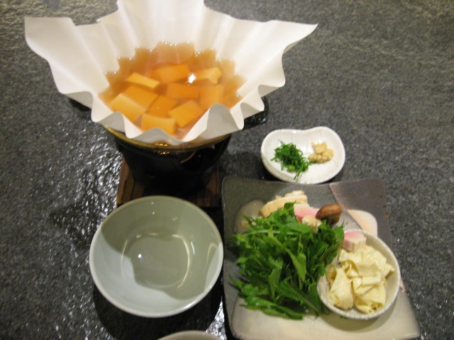 紙の鍋にダシが入っていて、そこで普通の鍋と同じように野菜や湯葉を茹でる。