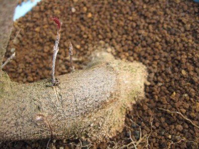 昨年途中、上部を飛ばして足元付近から伸びている芽を伸ばしています。河内の親父さんが言われる喬木が一時的に起こす潅木の性質を利用したものです。